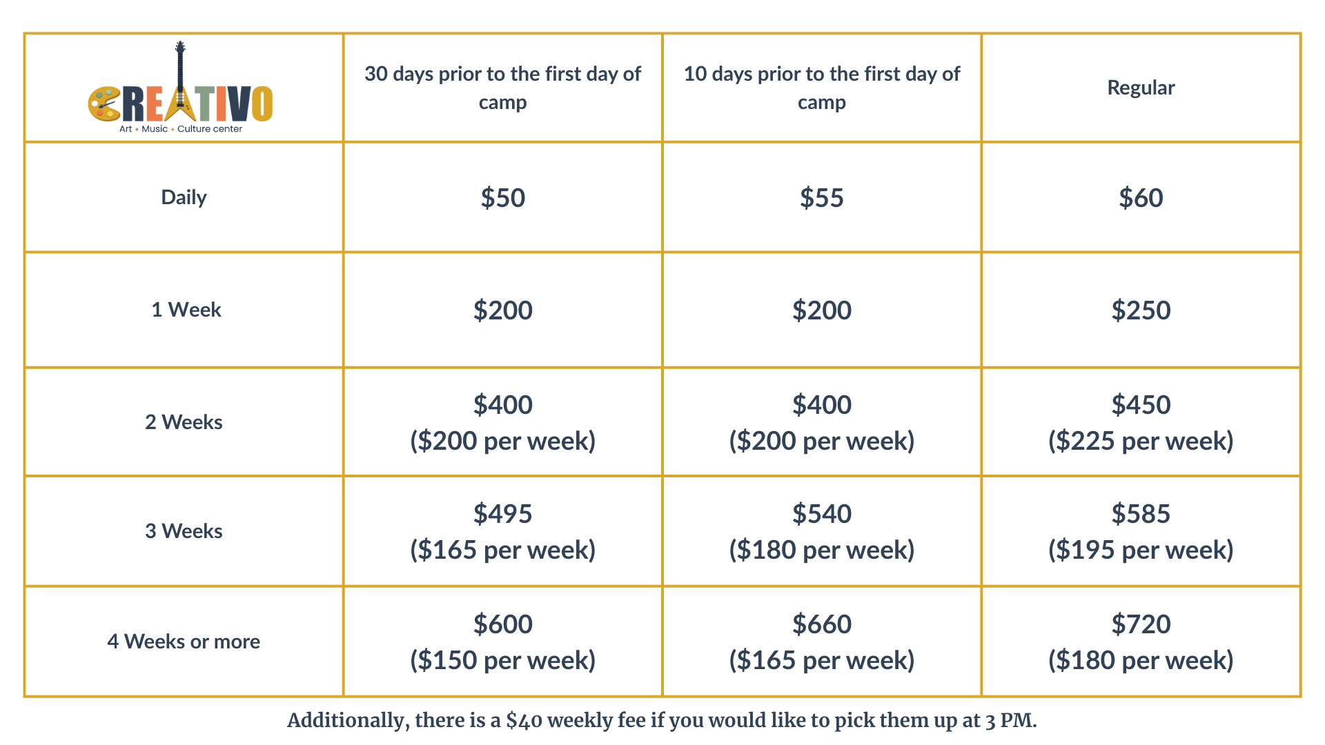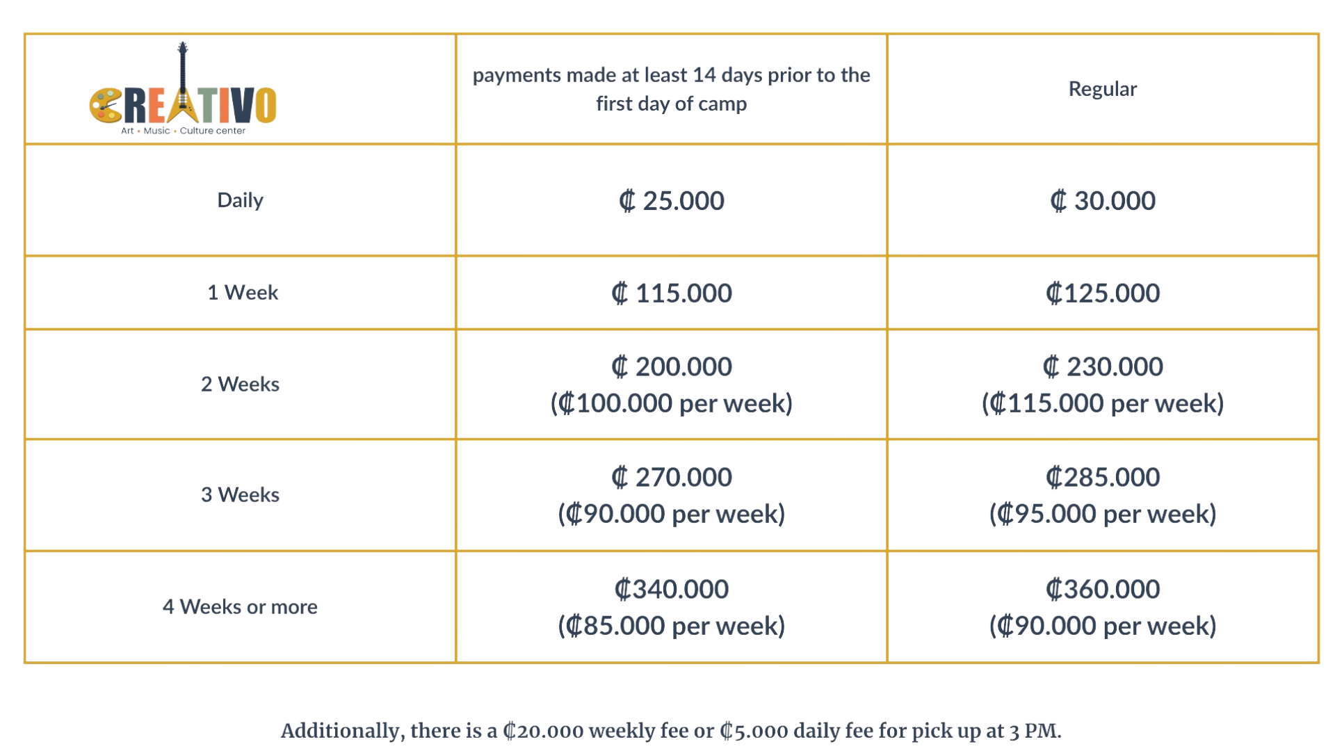 Once the payment is made, no refunds will be issued. A child's spot in the camp is only reserved upon payment. Modifications can be made up to 7 days before the camp start date. Each child must bring their own lunch and a change of clothes. Camp hours are strictly from 9:00 AM to 2:00 PM or 3:00 PM, depending on the chosen schedule. If a child is picked up late, an additional fee of $10 will be charged.